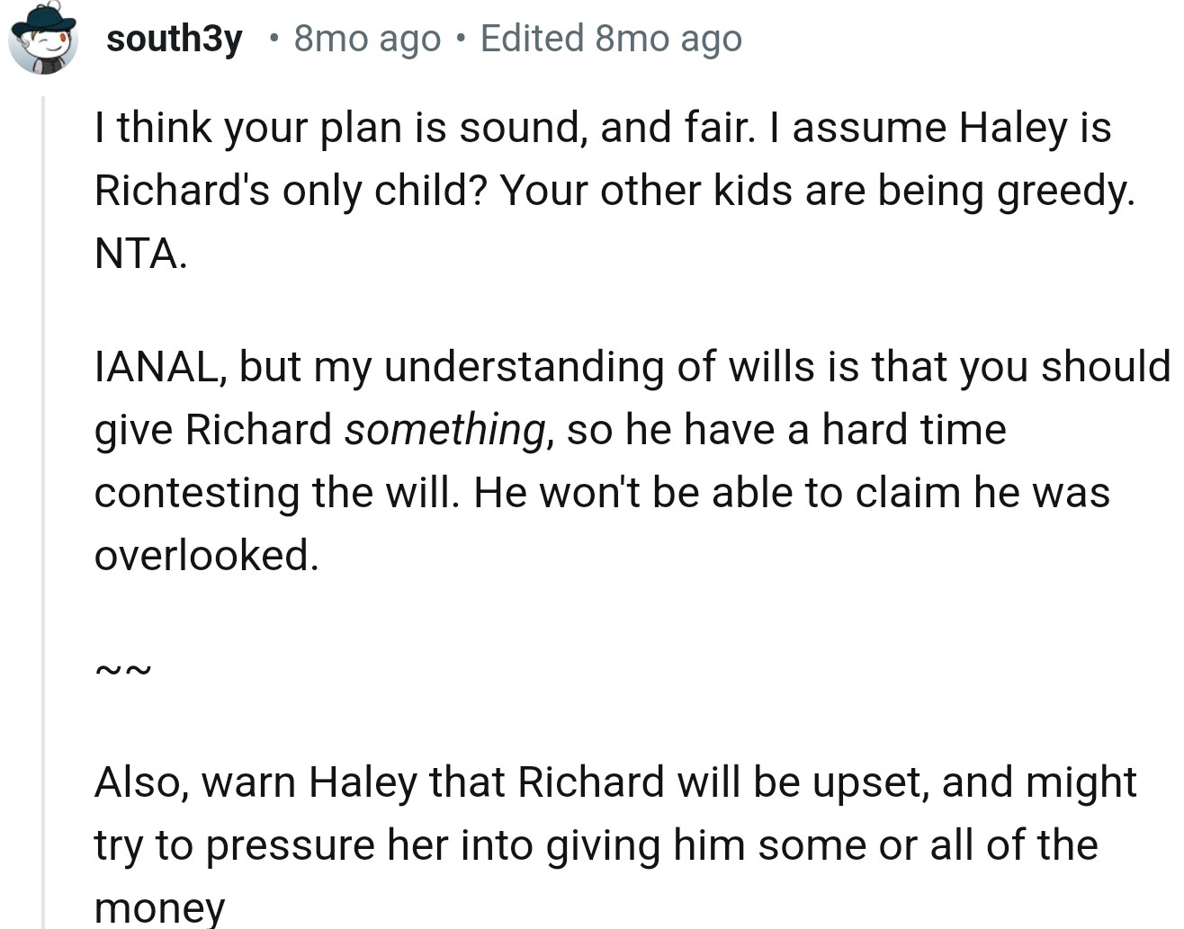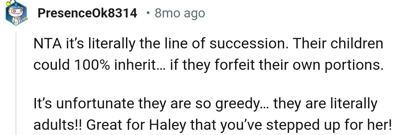 The thing was, OP’s other two kids were sitting pretty on substantial assets of their own, so their kids had no worries about the future. Haley, on the other hand, was definitely getting nothing from her father.