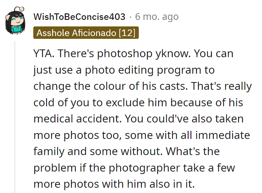 This decision sparked a debate within their family and among Reddit users. While OP believed it was their right to decide who appears in their wedding photos, the exclusion of a family member over something as trivial as cast colors raises questions about the priorities and values at play.