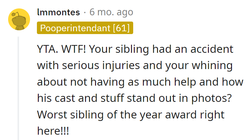 The bride's desire to exclude her injured brother from wedding photos speaks to the powerful influence of social expectations on individual behavior. Research from the University of Chicago indicates that societal standards often dictate how individuals perceive familial obligations, particularly during significant life events. In this case, the bride's focus on aesthetics may overshadow her emotional connection to her brother.
