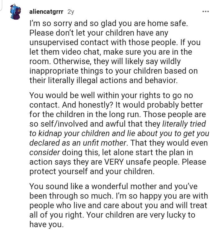 "I’m so sorry and so glad you are home safe. Please don’t let your children have any unsupervised contact with those people."