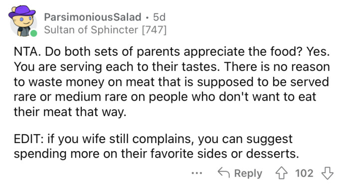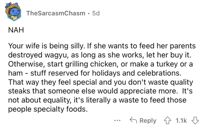 Since then, the OP says he buys select-grade meat for when his in-laws visit, saving the good-quality Wagyu for when his own parents come over.