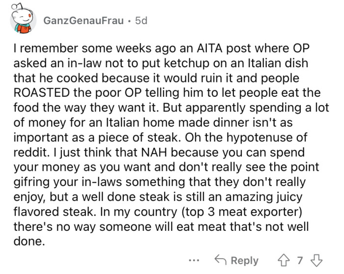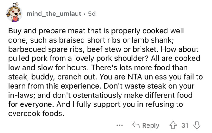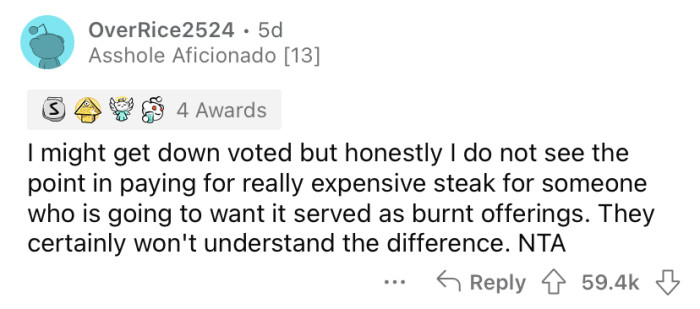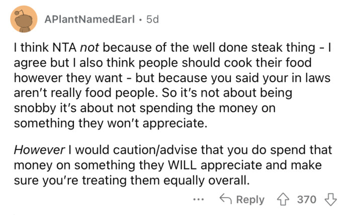 The Redditor mentions that it took him many years to convince his wife to try a medium-rare steak, but when she finally did, she loved it. So, when his in-laws visited, the OP cooked some amazing prime steak for them to enjoy medium-rare.