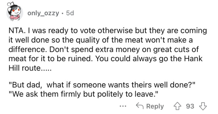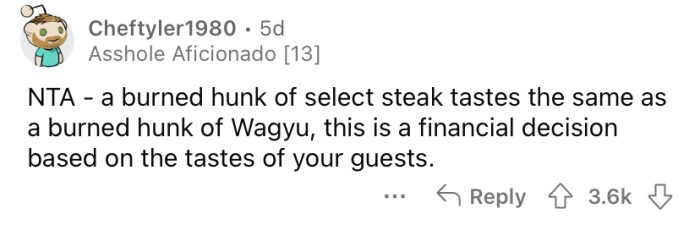 However, the OP says he "died a little inside" when his FIL took the meat back to the grill and "destroyed" it. Since then, the OP says he buys select-grade meat for when his in-laws visit and saves the good-quality Wagyu for when his own parents come over.