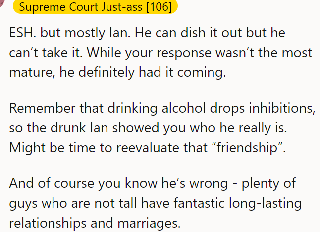 As a teetotaler who despises alcohol, the OP found himself in an uncomfortable situation as the others got drunk and started making jokes, one of which targeted his height and single status. Ian commented that he was not surprised the OP is still single, considering his height, and said that most women would pass on him immediately.