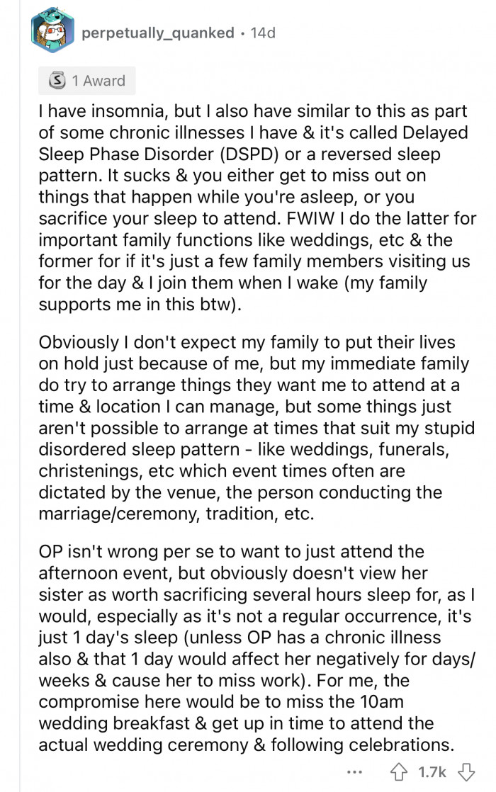Insomniac Refuses To Attend Her Sister's Wedding That Starts At 10 AM Because Of Her Unusual Sleep Schedule