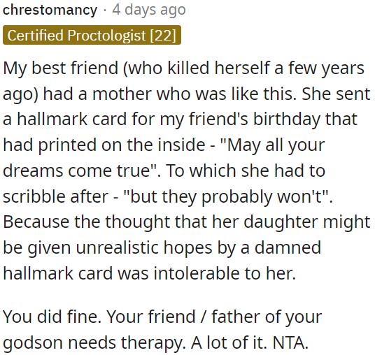 However, when the child's father (and OP's best friend) found out, he wasn't happy. He thought his son's dream was too far-fetched and told the godfather he should have been more realistic with the child instead of letting him dream too big.