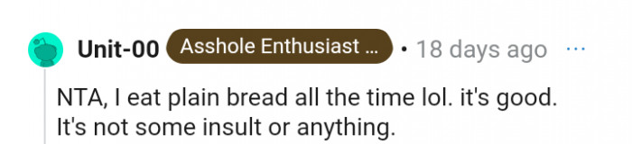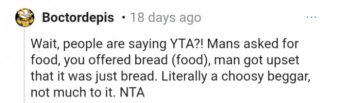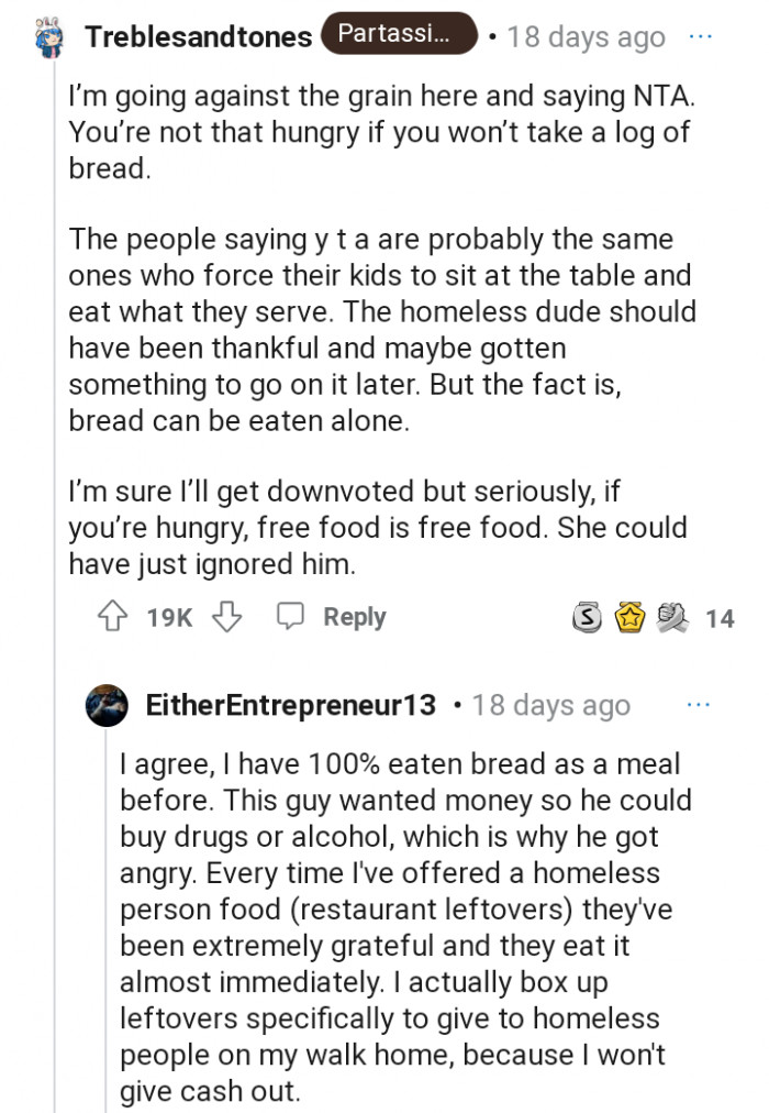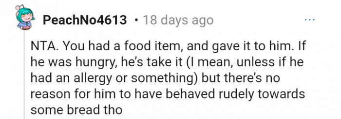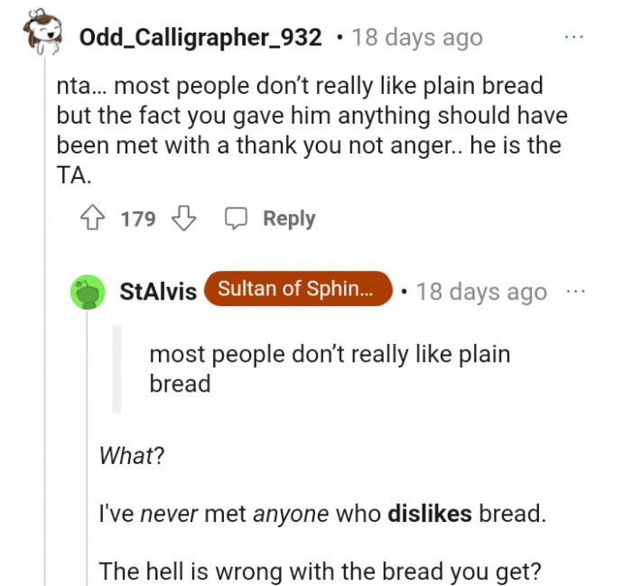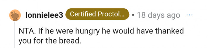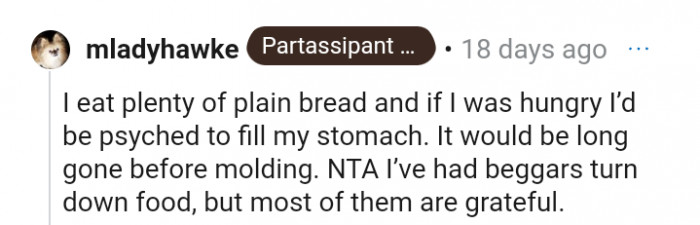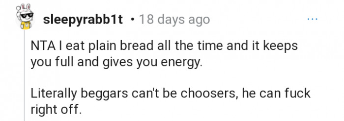 "Most people don’t really like plain bread but the fact you gave him anything should have been met with a thank you"