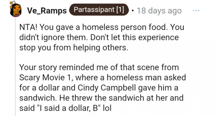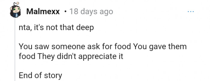 "You saw someone ask for food You gave them food. They didn't appreciate it"