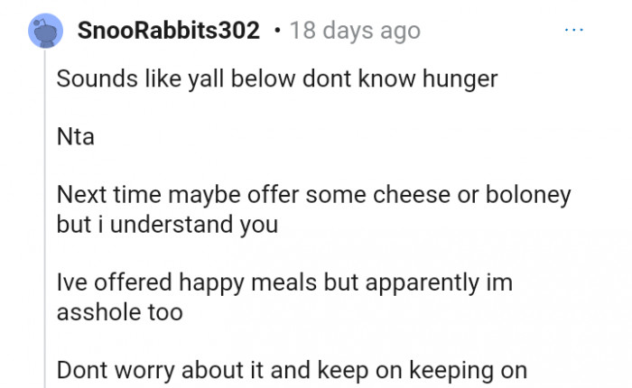 "Next time maybe offer some cheese or boloney but i understand you"