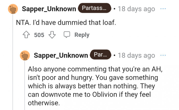 Spare_Violinist / reddit.comShe offered the man a loaf of bread, but her gesture was met with insults. Apparently, the man felt she should have given him something else to eat the bread with
