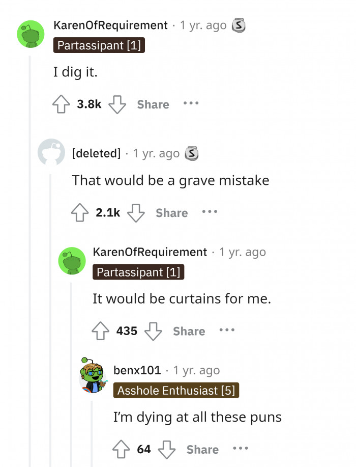 "I dig it." All these puns are just witty and hilarious.