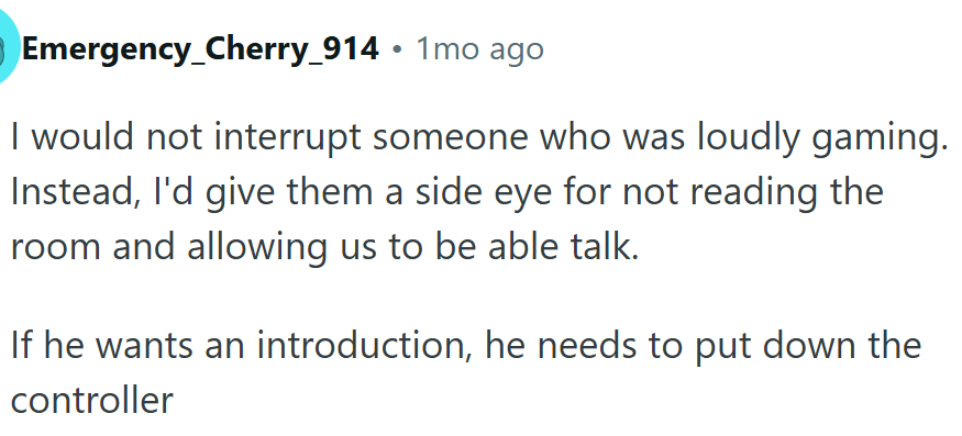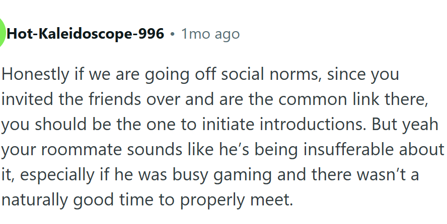 The roommate, who was loudly gaming with his own online friends at the time, later scolded them for not introducing themselves. He argued that the guests should have been “adults” and initiated the greeting, despite being occupied and unavailable for conversation.