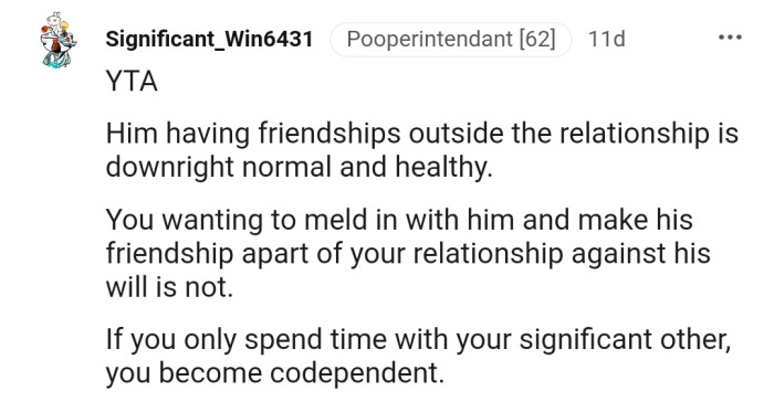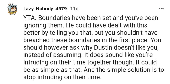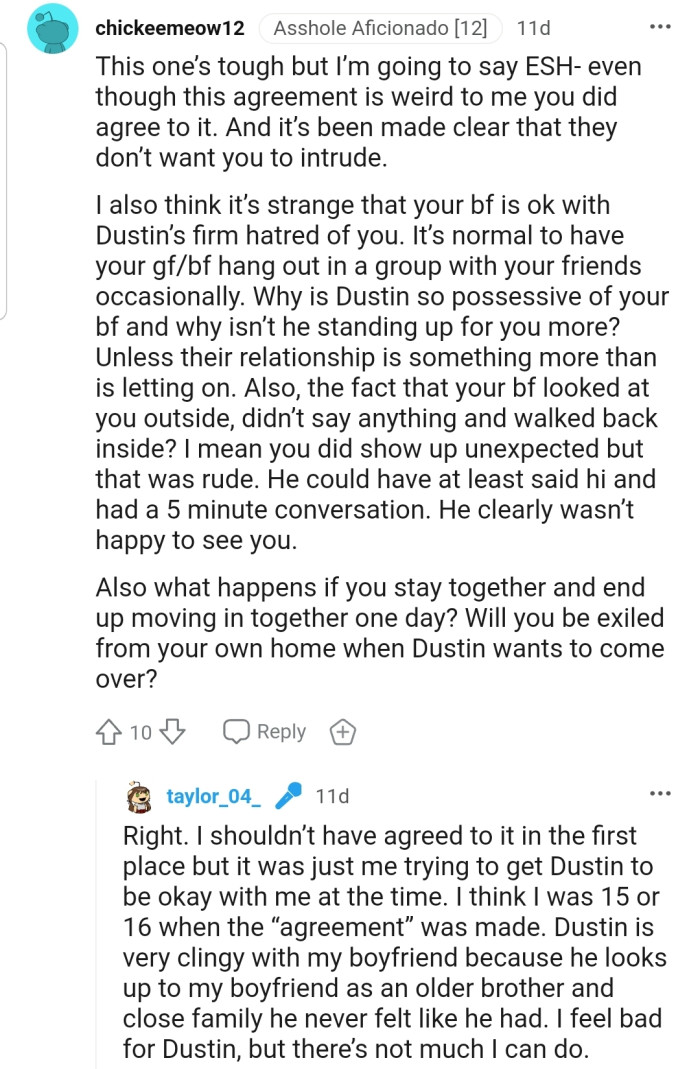 This led OP to wonder if she was actually crossing some boundaries by wanting her boyfriend's attention, even when he was hanging out with Dustin.