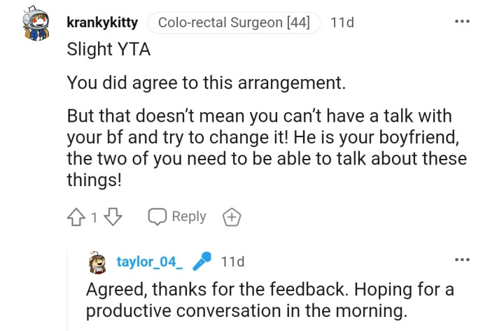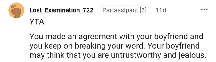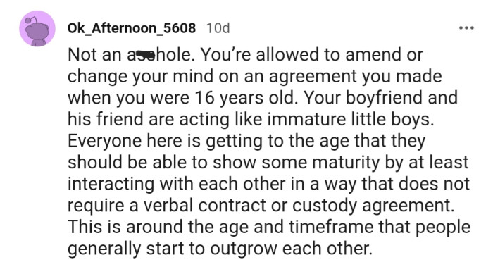 The Reddit community is split in its decision. Some people believe everyone is at fault; some have called her the AH for not respecting their agreement, while another group has labeled her as NTA.