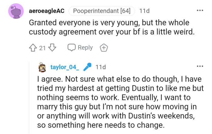OP explained that her boyfriend’s friend, Dustin, doesn’t like her, despite her best efforts to get to know him. As a result of his dislike, OP and her boyfriend devised a sort of "friend custody arrangement."