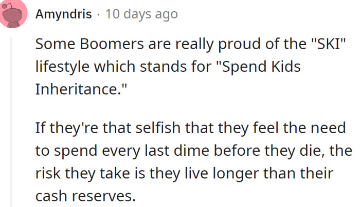 "SKI" lifestyle stands for "Spend Kids' Inheritance." The risk they take is that they live longer than their cash reserves.