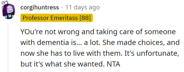 Years later, at 83, the OP's mother's financial situation worsened, and her husband developed dementia. She approached the OP for help, but remembering her earlier comments, the OP refused.