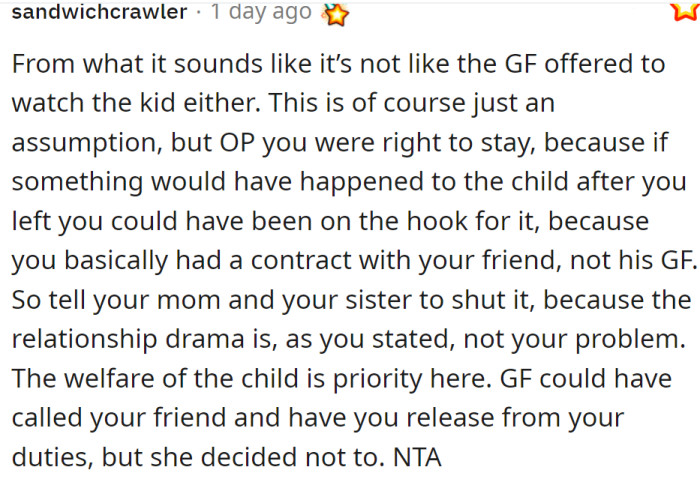 Recently, the friend's girlfriend texted the OP, saying she would never babysit for her boyfriend again and that he agreed with her. The OP ignored that message as she believed she couldn't leave the job she was paid for.