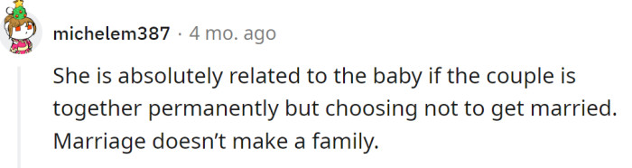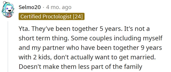 After hearing the OP's story, Redditors almost unanimously voted that the OP was in the wrong. They explained that marriage doesn't make a family; besides, they already live together and have been together for five years.