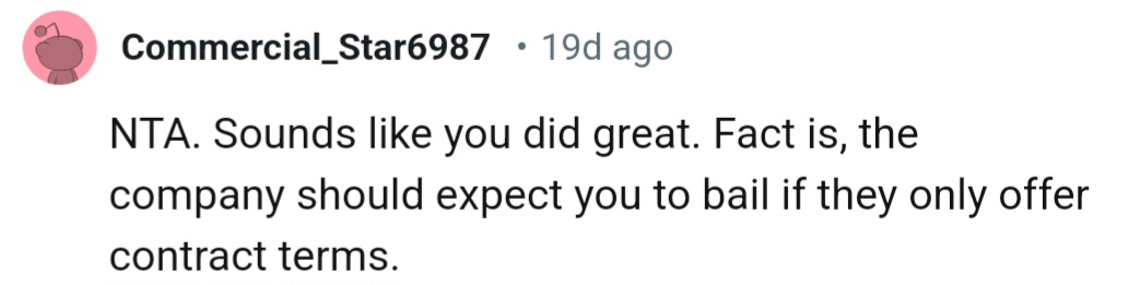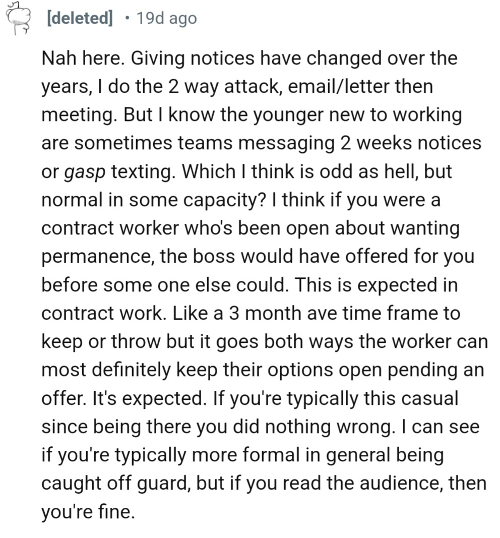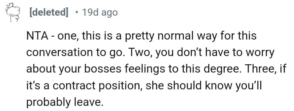 Their boss was taken aback. She inquired if they were unhappy or if the work wasn’t up to par. OP reassured her that it wasn’t about dissatisfaction but rather about seeking a more permanent position since they were only contract staff.