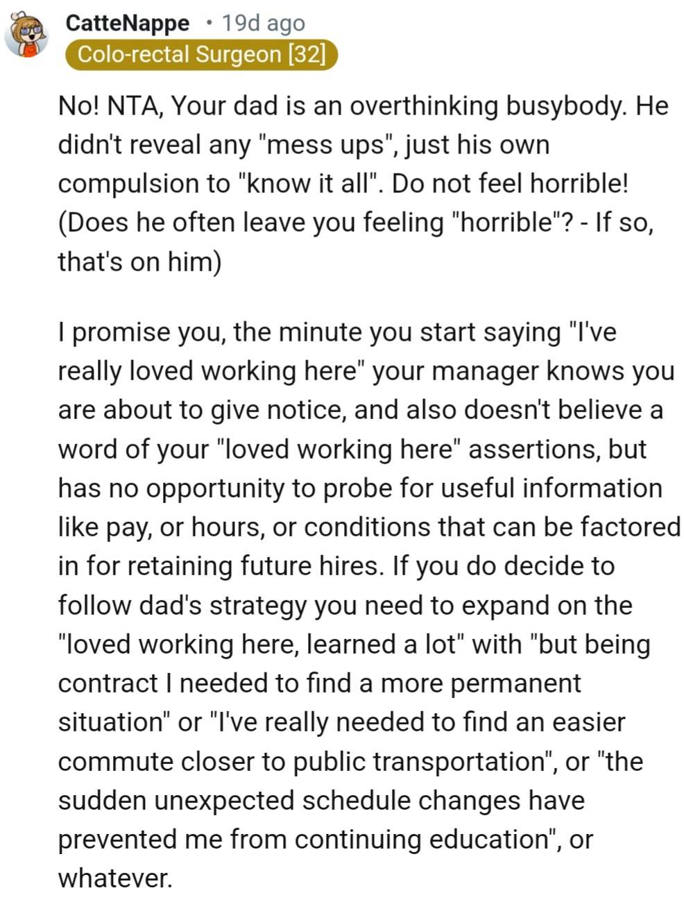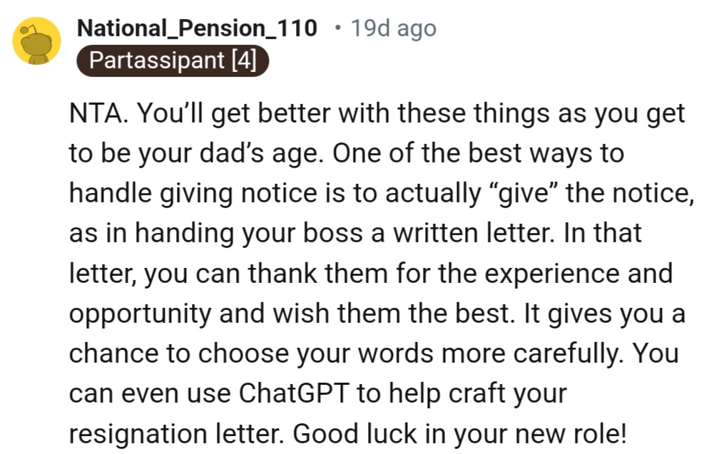 This boosted OP's mood significantly for the next couple of hours, and then came the call with their dad. As OP recounted the conversation with their boss, their dad offered a critique that hit hard: they should have led with praise for the current job before mentioning their resignation.