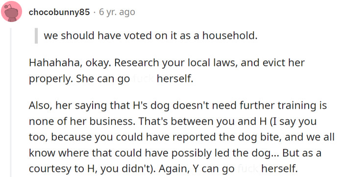 Consequently, the OP asked H not to bring the dog over anymore. H agreed, but the roommate was upset because she believed it was a decision they were supposed to discuss and decide together.