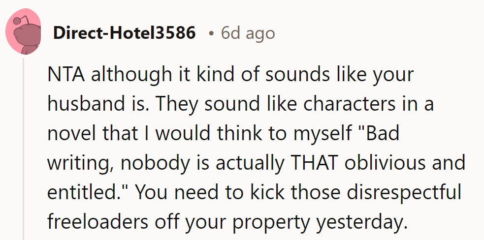 "You need to kick those disrespectful freeloaders off your property yesterday."