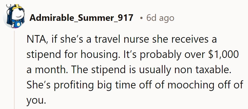 RedditOP's sister pays just $50 for rent despite being a traveling RN with a sign-on bonus, hinting she may have more money than she claims.