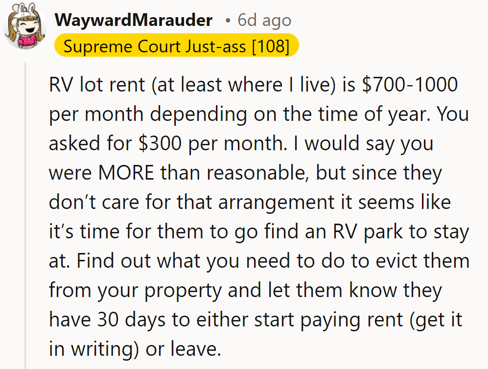 Time for them to upgrade from 'driveway deluxe' to 'campground chic.' Happy trails, freeloaders!