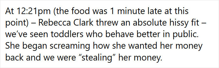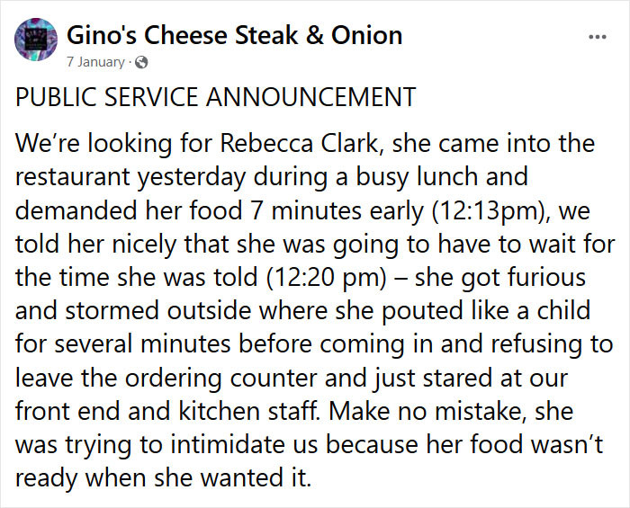 Facebook/Gino’s Cheese Steak & Onion"Rebecca Clark threw an absolute hissy fit."
