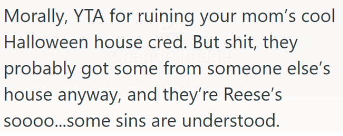 They said around fifty kids came to the house that night, and most still received the Reese’s cups since there was plenty to go around. Still, OP’s mom was upset when she found out about the candy swap, calling them selfish. OP explained that they didn’t think it was a big deal, especially since only about twenty kids received the sour candies.