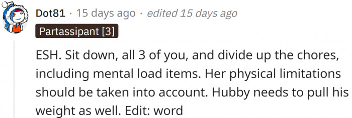 The husband does little or nothing. Now OP asks: