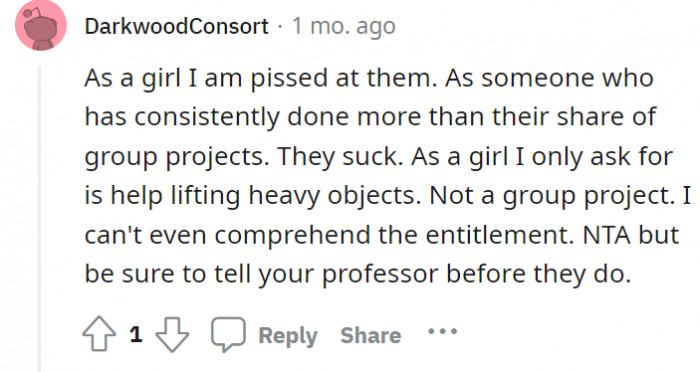 "As a girl, all I ask for is help lifting heavy objects, not a group project." Slay!