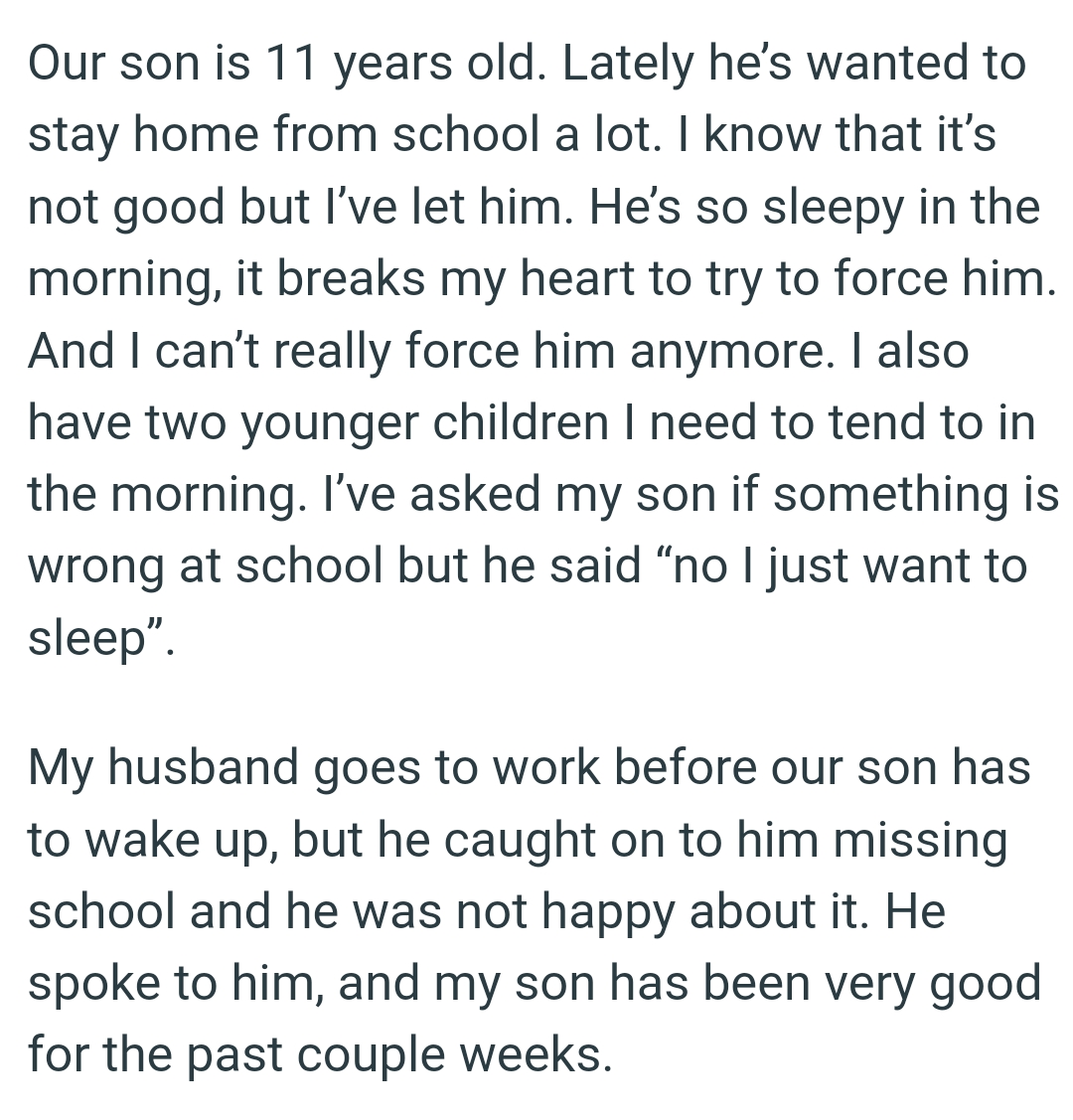 The thing is, OP's son has been wanting to stay home from school a lot, and it breaks OP's heart to try to force him. OP's husband goes to work before their son has to wake up, and he speaks to him after he finds out.