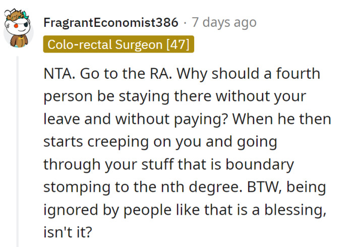 RedditRoomie's boyfriend lacks boundaries, entering without asking or knocking, making privacy uncomfortable even in common areas.