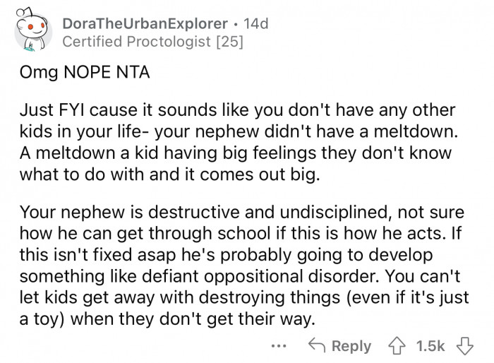 "Your sister is failing as a parent by not setting expectations for acceptable behavior for her son..."
