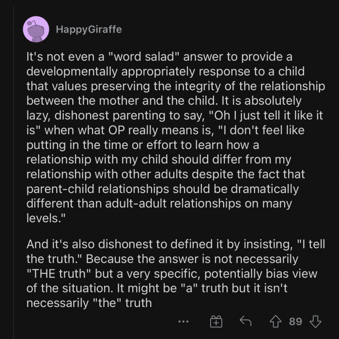 RedditOP is quite honest with his son and refuses to "give him a bunch of word salad answers to questions"