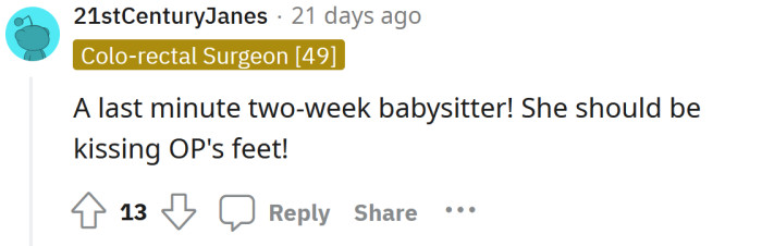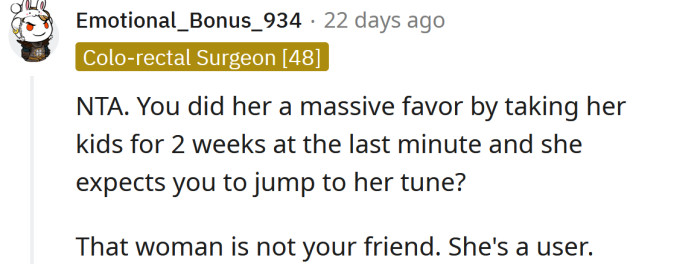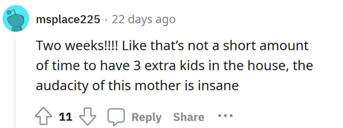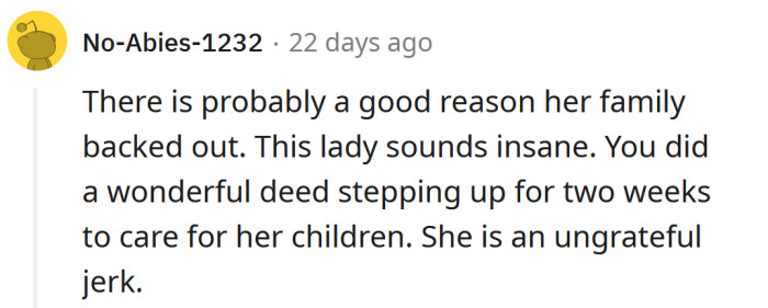 Reddit/EphemeralPirateShe explained that she agreed to babysit her friend's three children for two weeks while the parents went overseas after their original babysitting arrangements fell through.