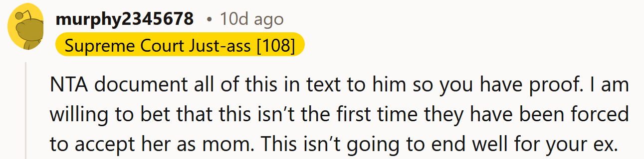 Their father told them that his wife acts as their mother when they're at his house, but the kids insisted she still wasn't their real mom.