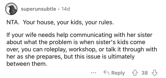 The Redditor's wife doesn't agree with this, and believes it is teaching their children to be "antisocial." So, the OP told the kids that the next time their cousins visited, they would not be allowed to hide in his office.