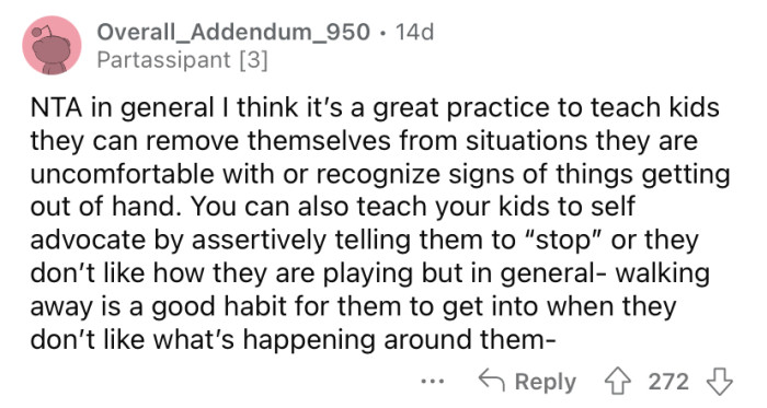 "It's great to teach your kids they can remove themselves from social situations they don't want to be in."