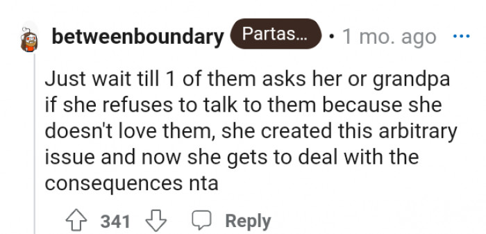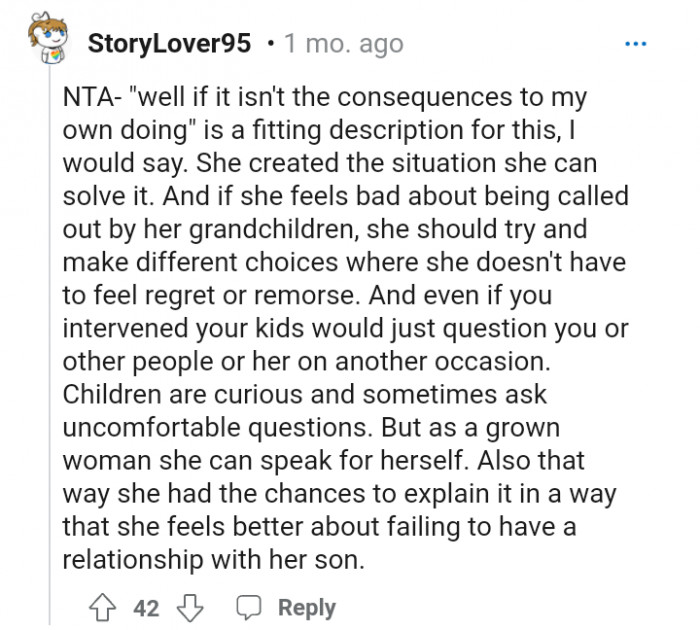 "If she feels bad about being called out by her grandchildren, she should try to make different choices where she doesn't have to feel regret or remorse"