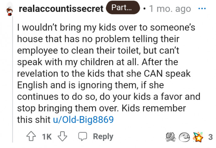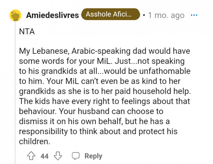 "Your MIL can’t even be as kind to her grandkids as she is to her paid household help"