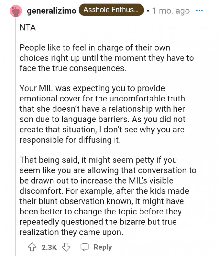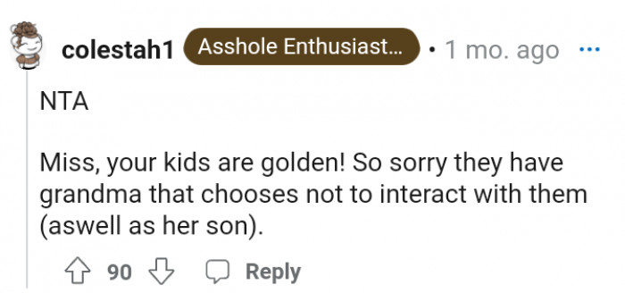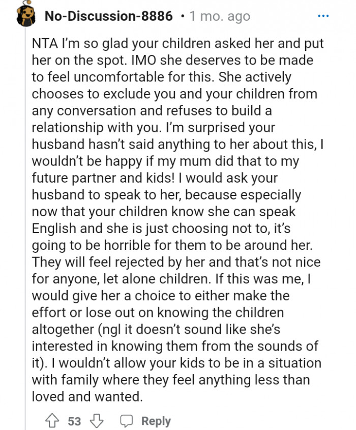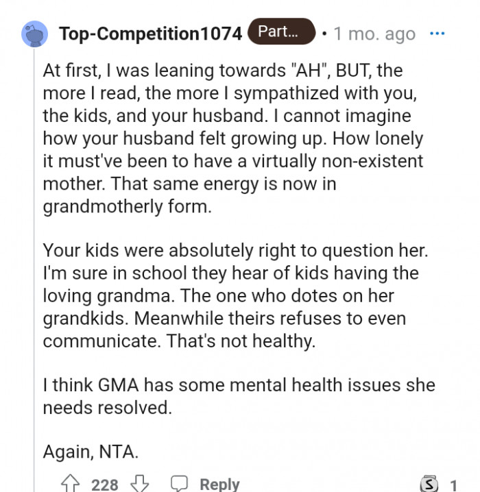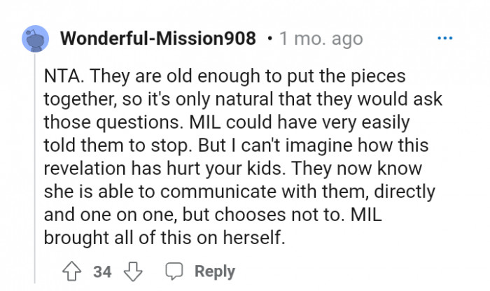 The Redditor also explained that her mother-in-law has almost no relationship with her and the kids. Indeed, nothing prepared Granny for such bombardment from a 9 and 11-year-old.