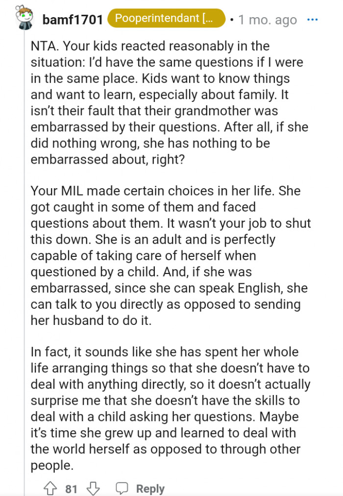 In a post that has since gone viral, a Redditor sought the opinions of users after explaining how her curious kids left her mother-in-law feeling embarrassed with some uncomfortable questions.