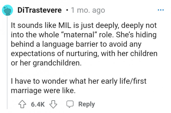 "She’s hiding behind a language barrier to avoid any expectations of nurturing"