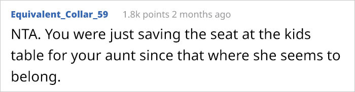 The Redditor's aunt requested that he sit at the kids' table because she believed that only individuals who have their own children could sit with grown-ups.