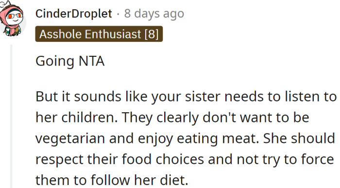 OP revealed that he has been hesitating to bring up his dilemma because it has turned into a significant issue within his family. His sister, Kylie, and her husband are both vegetarians and raise their ten- and thirteen-year-old daughters on a vegetarian diet as well.