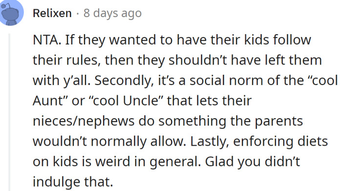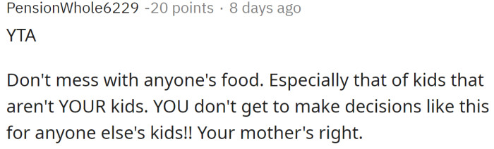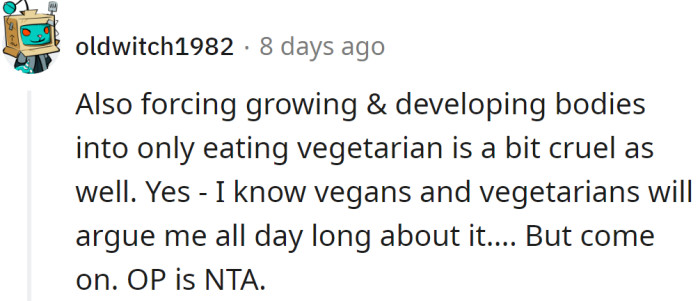 A majority of Redditors told OP that he wasn't wrong. They believe that kids are old enough to decide what they will eat.