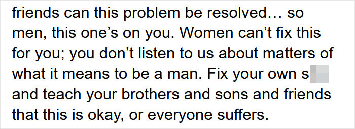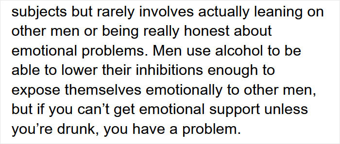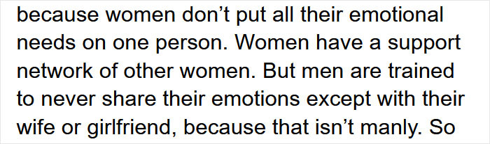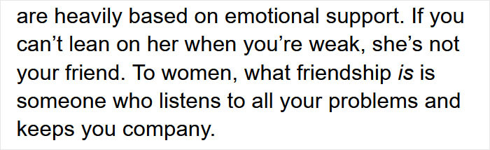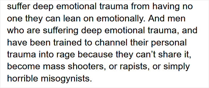 She clarifies in her post that everything makes sense because it all comes down to cultural and social conditioning. She states that men are discouraged from sharing their feelings, particularly with other men.